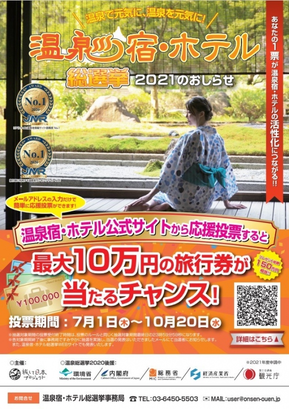 5省庁の後援のもと観光地活性化プロジェクトとして過去5年、「温泉総選挙」が行われており、2021年は新たに「温泉宿・ホテル総選挙」として開催されております。様々な企画や部門賞を通して日本全国の温泉地と宿・ホテルの相互的な魅力を発信し国民の皆様の旅行需要創出を促すことを目的とした企画です。